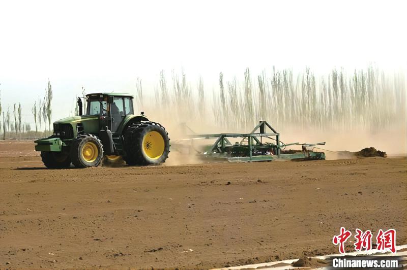 機車犁地、耙地,覆膜、播種等同步進行。